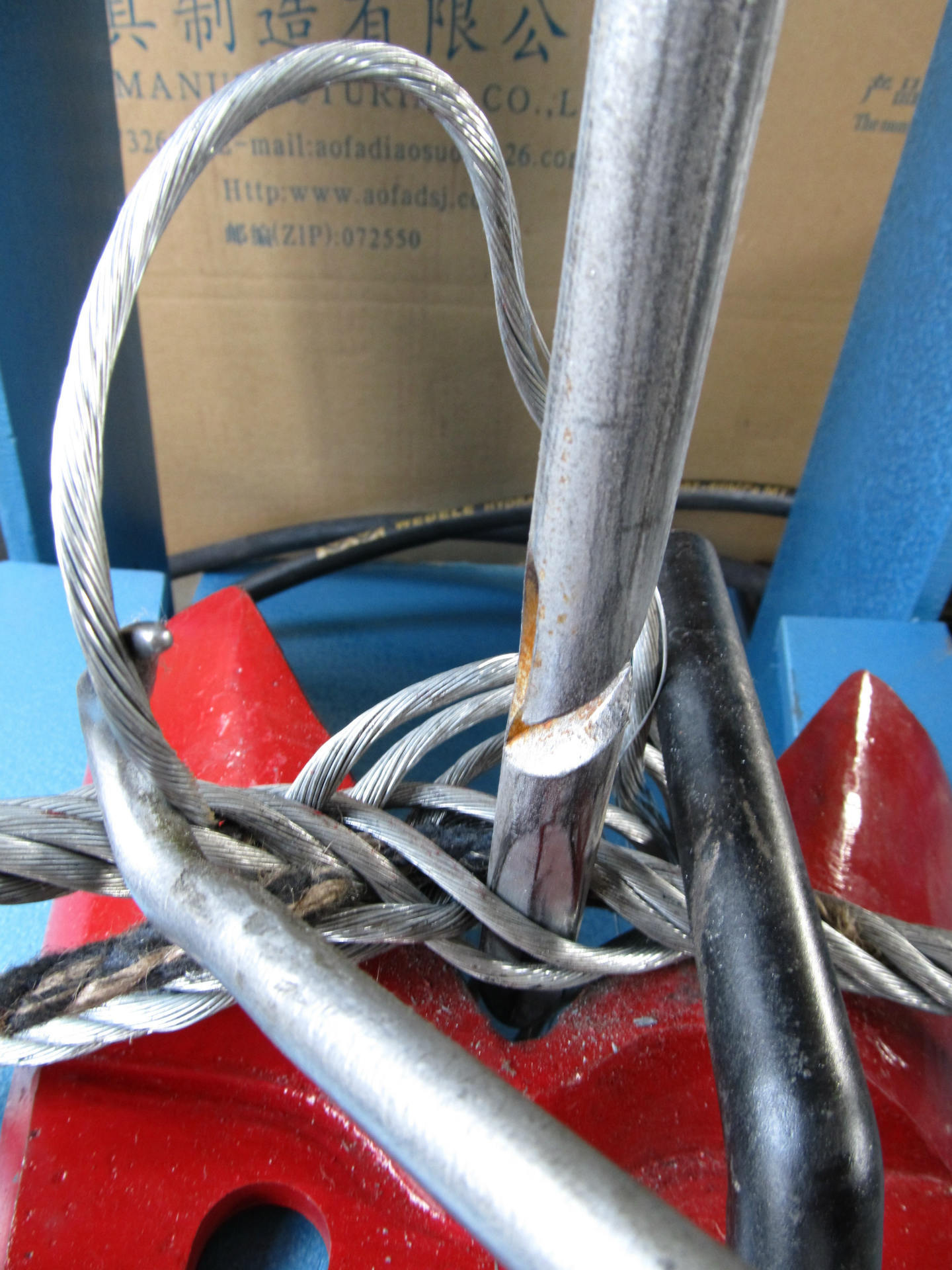 由于這種辦法使用的時間比較長,而且在人們心目中這種辦法深入鋼絲繩比較多,就比較安全。只是存在各方面的缺點,人工費用比較高,而且效率比較高,拿一個直徑20的為一人一天只能做20-30根,而鋼絲繩壓套機的效率非常高,十倍于人工。有人會擔(dān)心安全上不如人工,實際上,權(quán)威檢測證明,鋼絲繩壓制的安全性更高,費用比插編要低,這種方法會慢慢被接受。